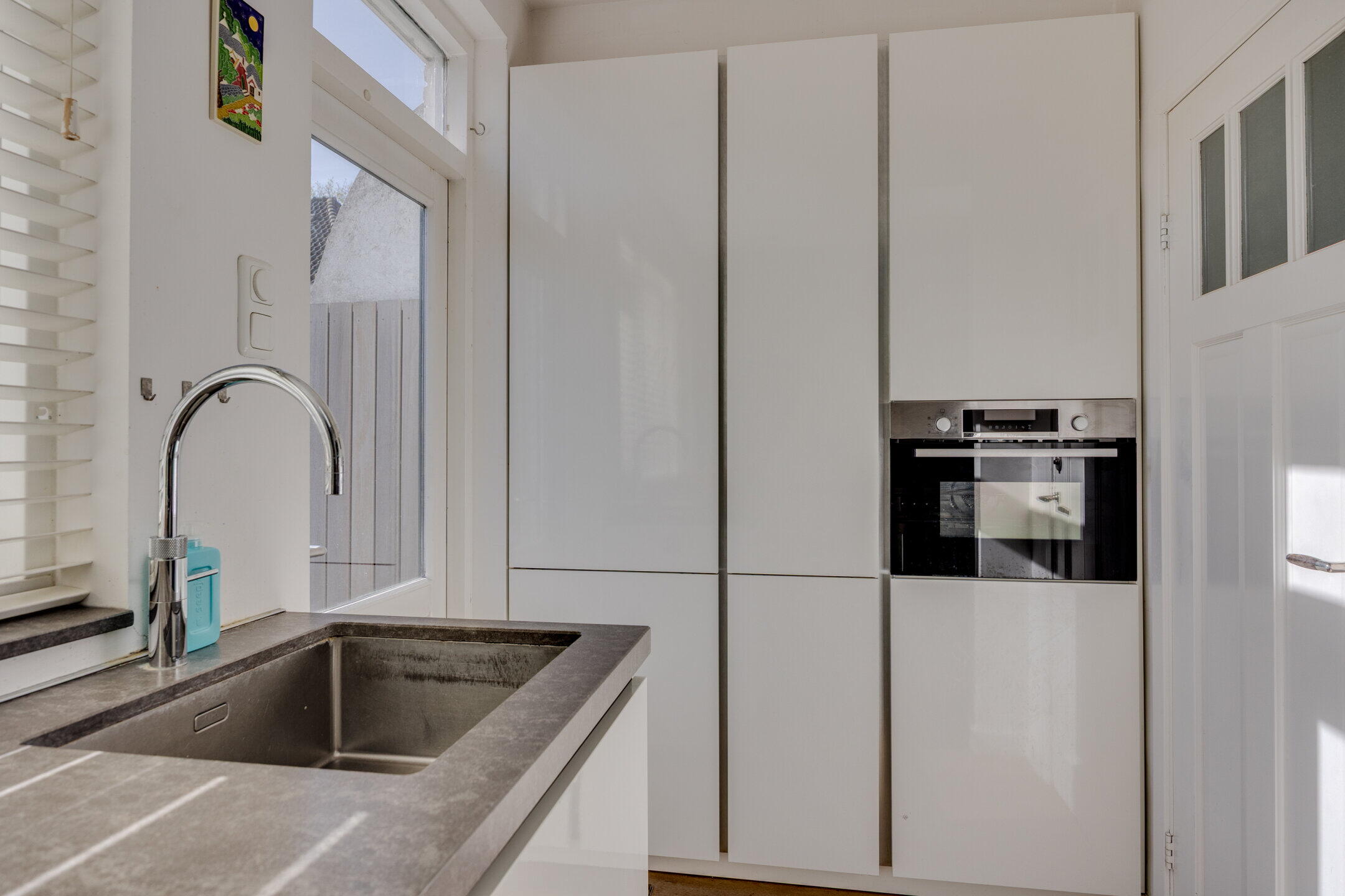De begane grond is over de volle breedte uitgebouwd en biedt een royale woon- en eetkamer met warme eikenhouten vloerdelen en een sfeervolle erker. De halfopen keuken uit 2018 is volledig uitgerust en de apparatuur is deels vernieuwd en biedt een breed fornuis, Bosch combi-oven (2025), Liebherr inbouwkoelkast (2025), Siemens vaatwasser (2024) en een Quooker. Het zwevende toilet is strak weggewerkt in de uitbouw.
